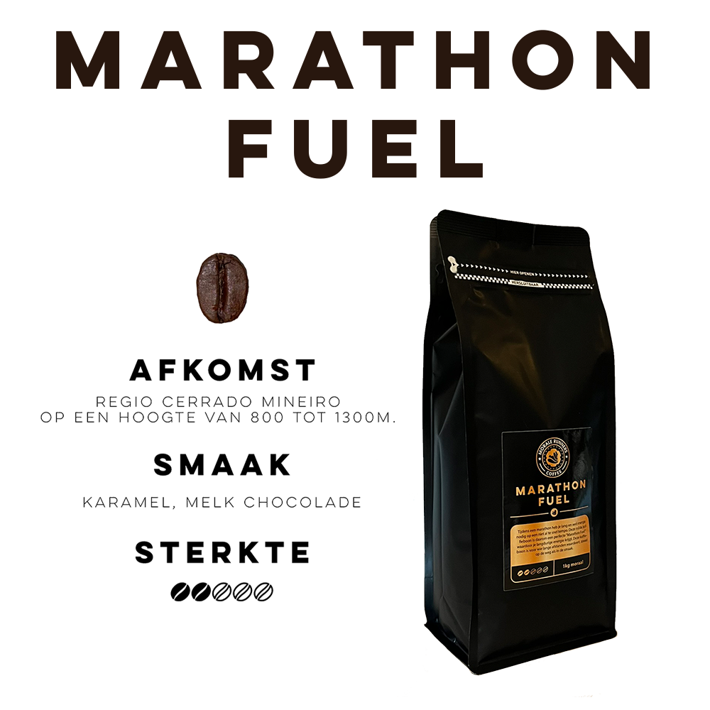 Marathon Fuel, afkomstig uit de Braziliaanse regio Cerrado Mineiro, wordt verbouwd op 800-1.300 meter hoogte. De gele koffiebessen en semi-washed methode zorgen voor een zachte, zoetere smaak met mokka-tonen. Dankzij 3.500 duurzame telers biedt deze koffie sociale verantwoordelijkheid, eerlijkheid en topkwaliteit in elke slok.